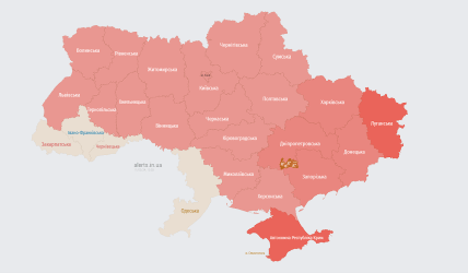 По состоянию на 11.35 карта тревог выглядела следующим образом. Сигнал об опасности с воздуха продолжается в Харьковской, Днепропетровской, Запорожской, Донецкой, Луганской областях и в Крыму.