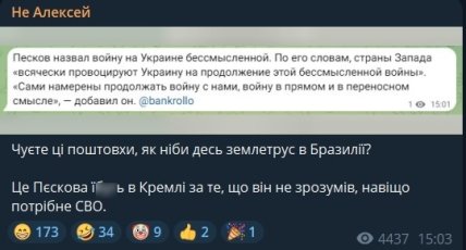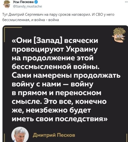 В сети не могли проигнорировать это высказывание приближенного к Владимиру Путину человека. Пескова назвали "умалишенным" и отметили, что он "наговорил на пару сроков": во-первых, назвал войну "войной", а, во-вторых, назвал вторжение Путина бессмысленным. В сети предположили, что вскоре Пескову придется ответить за свои слова, ведь его высказывания попадают под "закон о фейках" про армию РФ. За это грозит либо штраф в 700 тысяч рублей, либо три года лишения свободы.