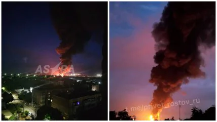 В ночь на 18 июня город Азов Ростовской области России подвергся мощной атаке беспилотников. В результате атаки загорелись резервуары с нефтепродуктами.