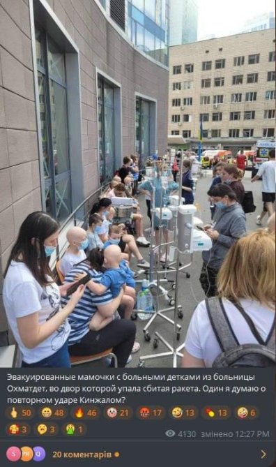 Один из российских пабликов опубликовал фотографию, на которой больные малыши со своими мамами находятся на улице вместе с медицинским оборудованием, которое поддерживает их жизненные функции. "Эвакуированные мамочки с больными детишками из больницы Охматдет, в двор которой упала сбитая ракета. Один я думаю о повторном ударе Кинжалом?" – говорится в сообщении.