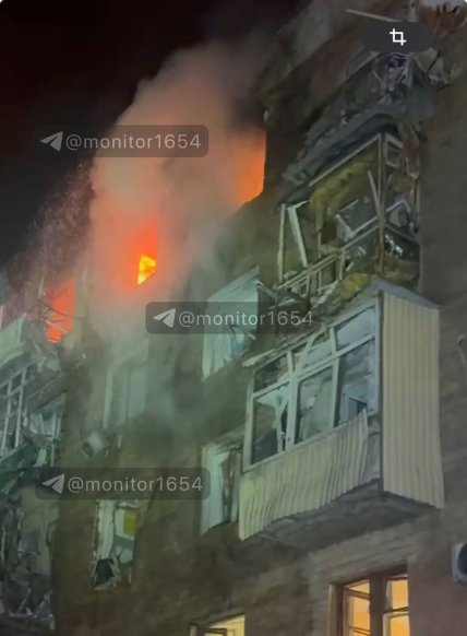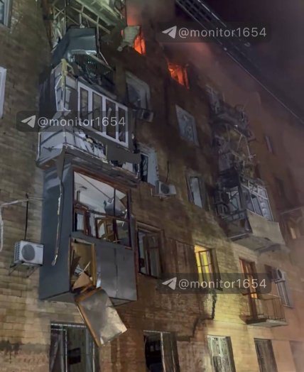 На снимках с места прилета видно, что в доме было разрушено несколько балконов, а также выбито много окон. Судя по всему, в одной из квартир на верхнем этаже было возгорание.