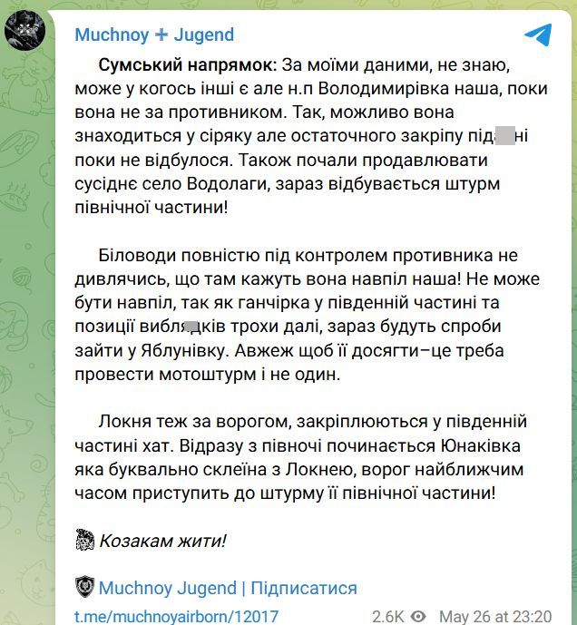 Военнослужащий ВСУ с позывным "Мучной" добавил, что Биловоды и Локня тоже оккупированы. При этом он отмечает, что Владимировка и Водолаги остаются под контролем ВСУ, но штурмы в их сторону уже идут.