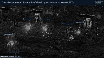 Снимок опубликовала компания Umbra. Снимок сделан 1 июня 2025 уже после атаки украинских дронов, на нем видно, что удар СБУ привел к следующим последствиям: