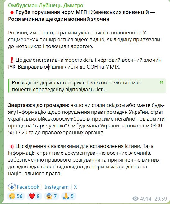 Лубинец призвал всех граждан Украины, которые обладают информацией об этом или аналогичных преступлениях, обращаться на горячую линию омбудсмена (0800 50 17 20).