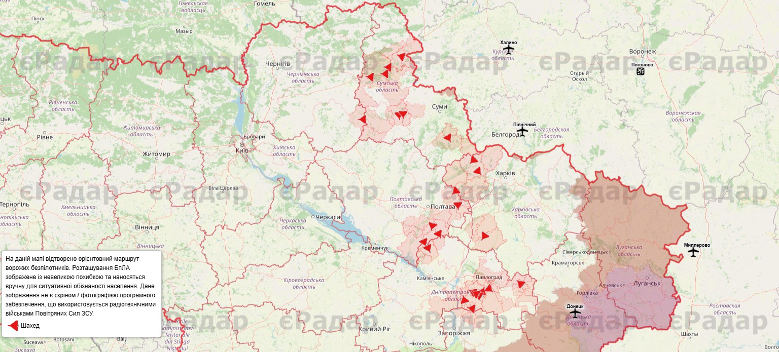Согласно данным мониторинговых каналов, на 00:30 в районе Днепра было зафиксировано около десятка беспилотников. Всего же над Украиной их замечено больше 20.