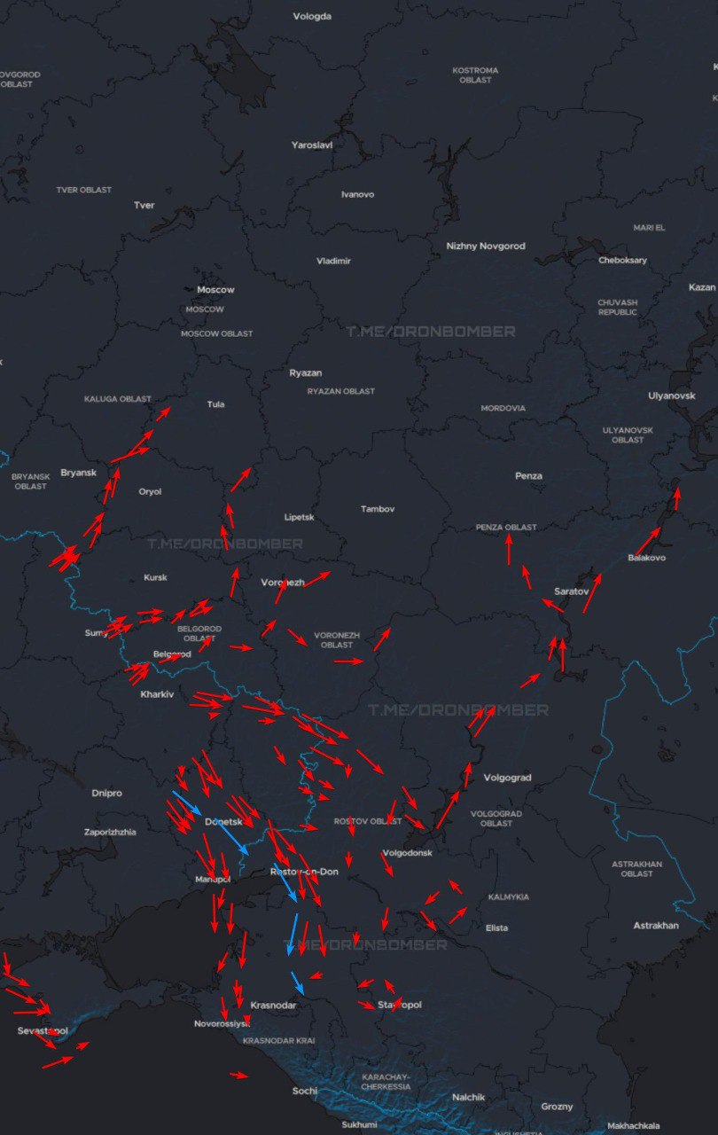 1:00 Россию и оккупированные территории Украины опять атакуют дроны
