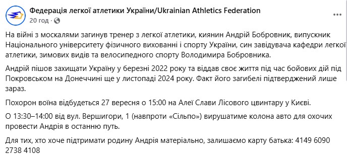О смерти Бобровника сообщила пресс-служба Федерации легкой атлетики Украины (ФЛАУ) в Facebook. Герой пал во время боев под Покровском (Донецкая область) в ноябре 2024 года, однако его смерть удалось подтвердить только сейчас.