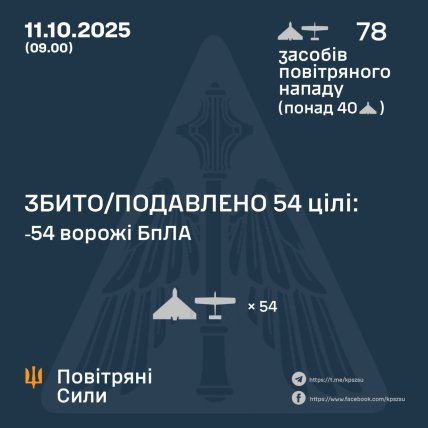 09:00 Минувшей ночью Россия атаковала Украину 78 беспилотниками. Силы ПВО Украины обезвредили 54 из них. Зафиксировано попадание 21 ударного БПЛА на 6 локациях. Атака продолжается, в воздушном пространстве несколько вражеских БПЛА.
