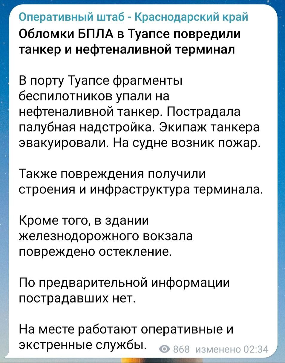Украинские дроны в ночь на 2 ноября во время ударов по России атаковали морской порт в Туапсе Краснодарского края РФ. Был поражен важный для российского нефтяного экспорта объект — Туапсинский морской нефтяной терминал "Роснефти", специально построенный для загрузки нефти в танкеры, в том числе приписанные к "теневому флоту" России.