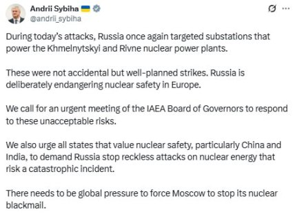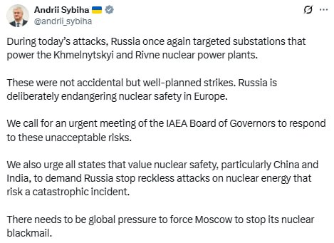00:00 Россияне били по подстанциям двух АЭС. Украина требует срочно созвать Совет МАГАТЭ, — министр иностранных дел Сибига. Во время сегодняшних атак РФ снова нацелилась на подстанции, питающие Хмельницкую и Ровенскую атомные электростанции. Это были не случайные, а хорошо спланированные удары.