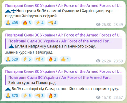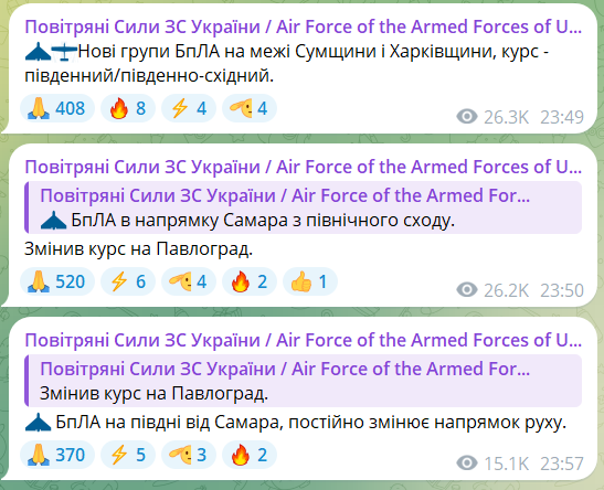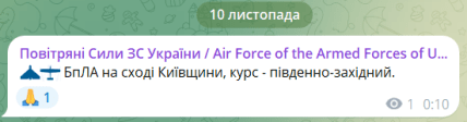 00:10 БПЛА на востоке Киевщины, курс – юго-западный.