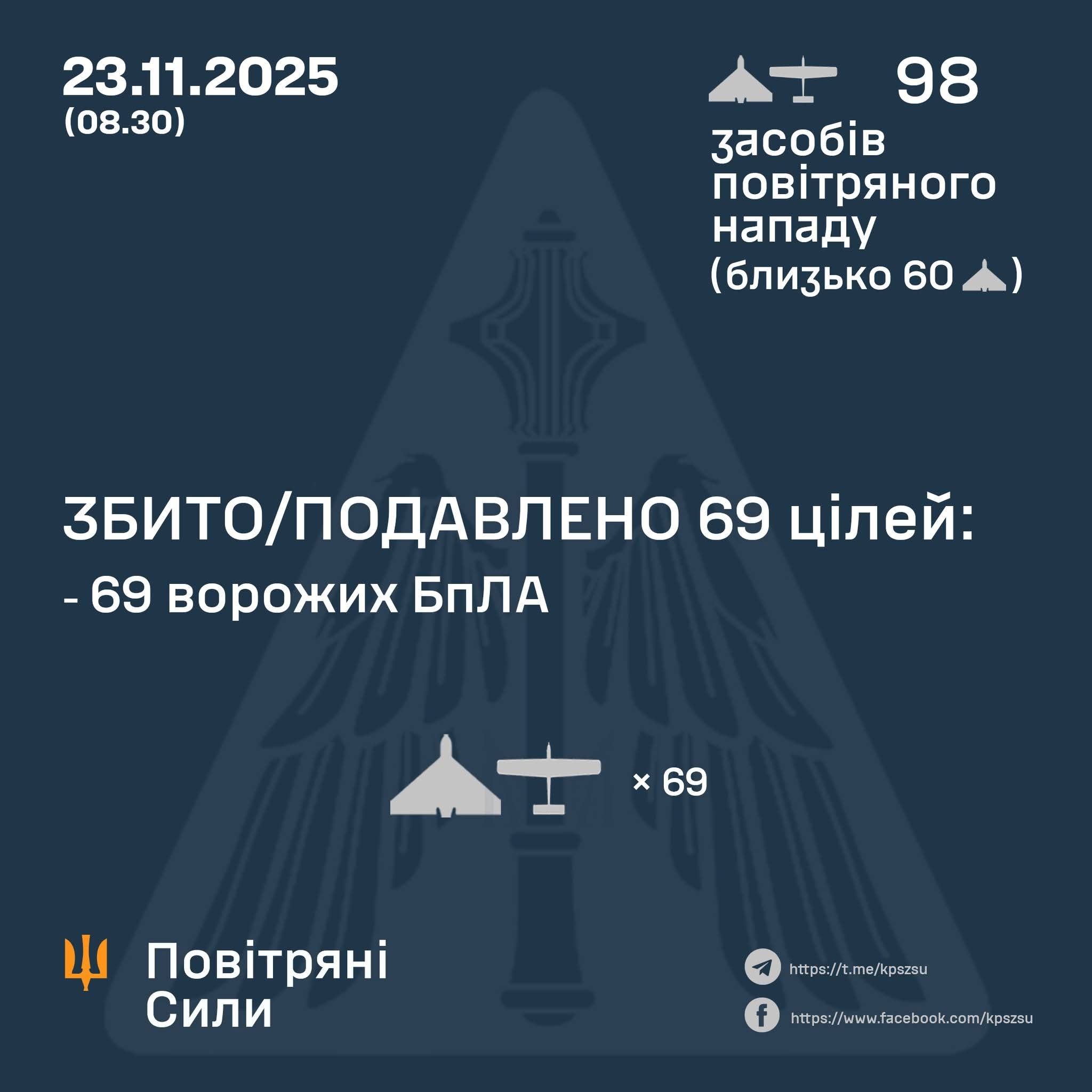10:00 В ночь на 23 ноября противник атаковал 98 ударными БпЛА типа Shahed, Гербера и беспилотниками других типов. Всего было сбито 69 дронов.