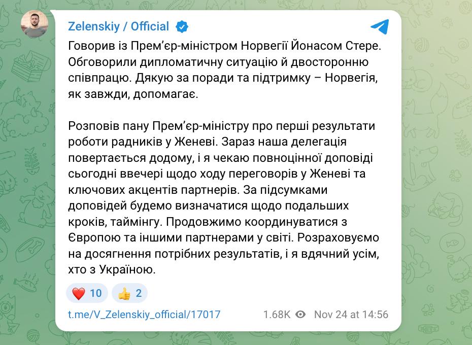 15:30 Украинская делегация уже возвращается из Женевы, — Зеленский. Президент ожидает доклада о результатах переговоров по мирному плану.