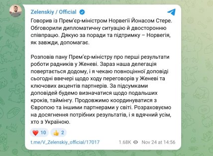- США и Украина сделали совместное заявление после переговоров в Женеве относительно мирного плана: "Переговоры были конструктивными, сосредоточенными и полными взаимного уважения, что подчеркнуло общую приверженность достижению справедливого и длительного мира. Обе стороны признали консультации крайне продуктивными. Стороны подтвердили суверенитет Украины и обеспечить устойчивый и справедливый мир. По итогам переговоров стороны подготовили обновленный и доработанный рамочный документ мира.
