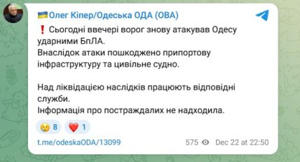 23:00 Россияне ударили по припортовой инфраструктуре и гражданскому судну в Одессе, — Кипер. Глава Одесской ОГА сообщил, что сейчас над ликвидацией последствий работают соответствующие службы. Информация о пострадавших не поступала.