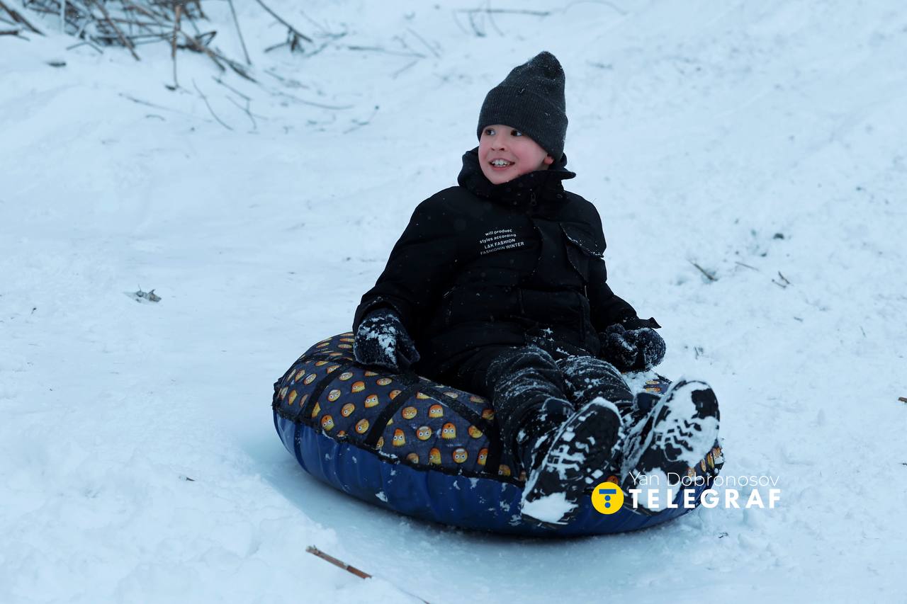 После снегопада на улицах много людей. Дети и взрослые радуются зимней погоде и возможности весело провести время. Все катаются на санках, специальных "тарелках" и других средствах, на которых можно съехать с горки.