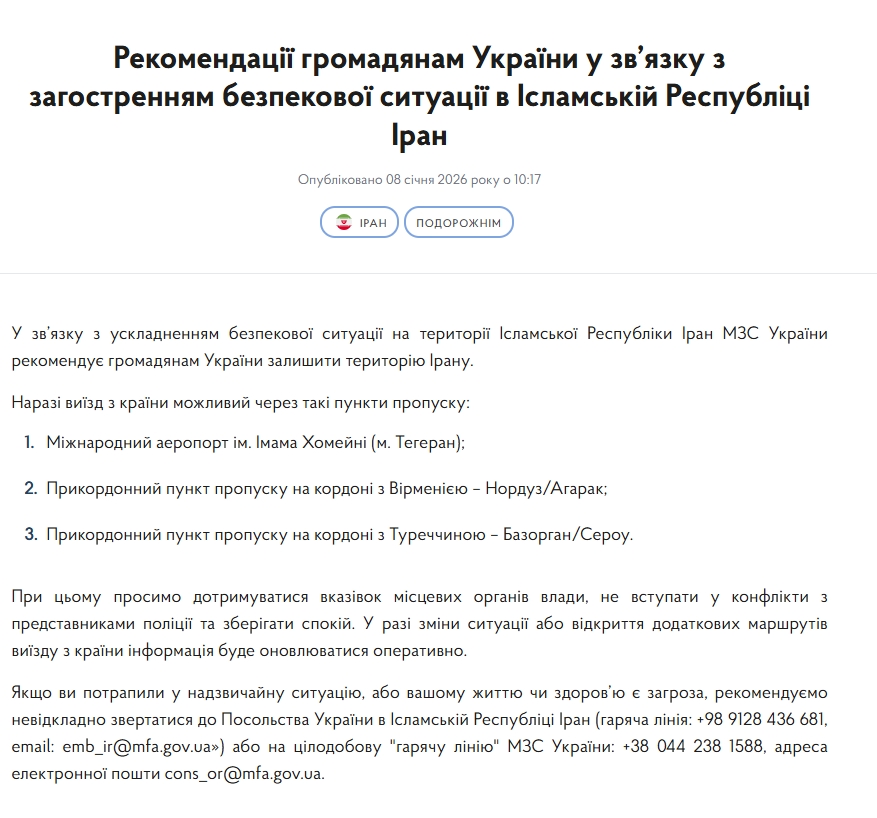 В Министерстве иностранных дел призвали украинцев, находящихся в Иране, покинуть территорию страны. Причиной называют обострение ситуации с безопасностью.