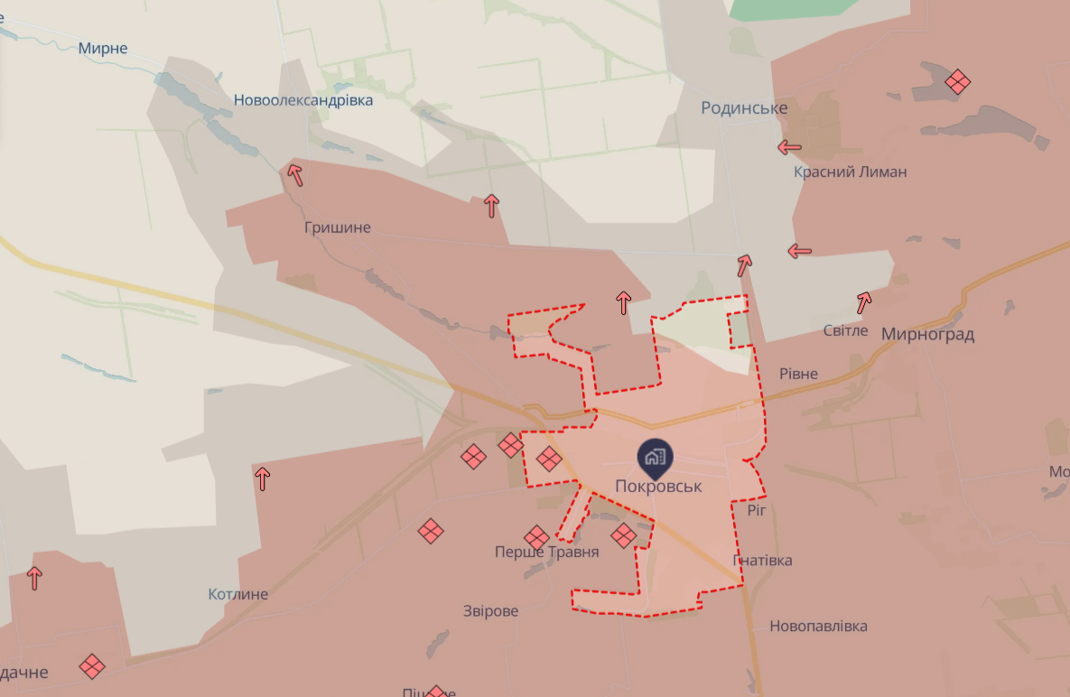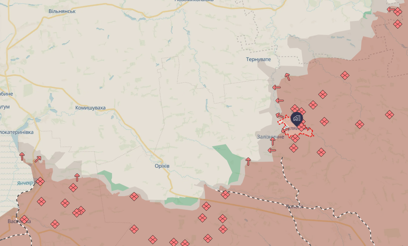 По оценке аналитиков Deepstate, россияне накапливают силы в Мирнограде и прорываются на Гришино. Кроме того, по данным Deepstate, продолжаются чрезвычайно интенсивные бои в районе Гуляйполя.